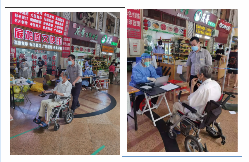 在南北广场检测现场,因检测点前的数级台阶不利于长者与坐轮椅者通行,金铭物业安防队员主动帮扶长者、搬抬轮椅,守护业户平安往返。